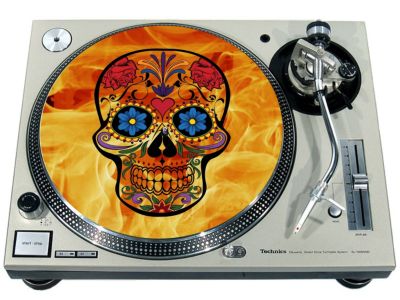 High quality felt turntable slipmat imprinted with an image of Skull Sugar Flames. The mat is regular thickness (3/32" or 2mm) and is sized to fit any 12 inch turntable. It is anti static, has a glazed bottom to grip and avoid slippage, feels great and works well for scratching or just playing your records. The image is impregnated into the surface of the mat, so it cannot scratch off or damage the record.