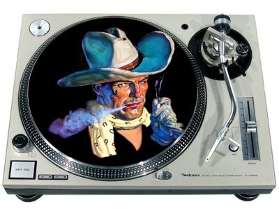 High quality felt turntable slipmat imprinted with an image of Smokin Cowboy. The mat is regular thickness (3/32" or 2mm) and is sized to fit any 12 inch turntable. It is anti static, has a glazed bottom to grip and avoid slippage, feels great and works well for scratching or just playing your records. The image is impregnated into the surface of the mat, so it cannot scratch off or damage the record.