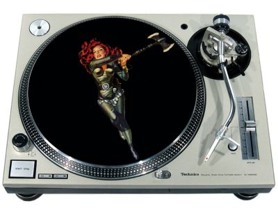High quality felt turntable slipmat imprinted with an image of Battle Queen. The mat is regular thickness (3/32" or 2mm) and is sized to fit any 12 inch turntable. It is anti static, has a glazed bottom to grip and avoid slippage, feels great and works well for scratching or just playing your records. The image is impregnated into the surface of the mat, so it cannot scratch off or damage the record.