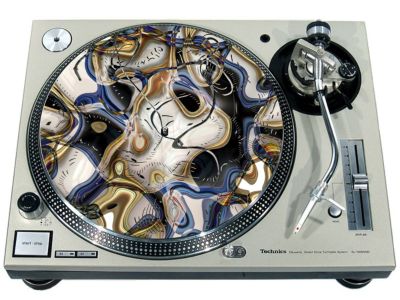 High quality felt turntable slipmat imprinted with an image of Time Distorted. The mat is regular thickness (3/32" or 2mm) and is sized to fit any 12 inch turntable. It is anti static, has a glazed bottom to grip and avoid slippage, feels great and works well for scratching or just playing your records. The image is impregnated into the surface of the mat, so it cannot scratch off or damage the record.