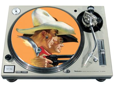 High quality felt turntable slipmat imprinted with an image of Two Hired Guns 1. The mat is regular thickness (3/32" or 2mm) and is sized to fit any 12 inch turntable. It is anti static, has a glazed bottom to grip and avoid slippage, feels great and works well for scratching or just playing your records. The image is impregnated into the surface of the mat, so it cannot scratch off or damage the record.
