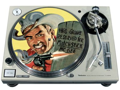 High quality felt turntable slipmat imprinted with an image of Wild West 6. The mat is regular thickness (3/32" or 2mm) and is sized to fit any 12 inch turntable. It is anti static, has a glazed bottom to grip and avoid slippage, feels great and works well for scratching or just playing your records. The image is impregnated into the surface of the mat, so it cannot scratch off or damage the record.