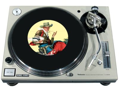 High quality felt turntable slipmat imprinted with an image of Wild West 11. The mat is regular thickness (3/32" or 2mm) and is sized to fit any 7 inch turntable. It is anti static, has a glazed bottom to grip and avoid slippage, feels great and works well for scratching or just playing your records. The image is impregnated into the surface of the mat, so it cannot scratch off or damage the record.