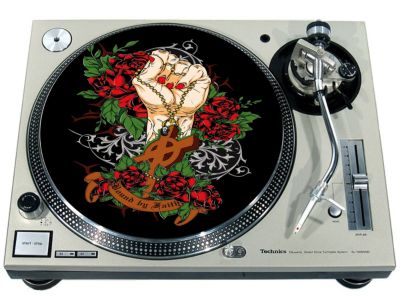 High quality felt turntable slipmat imprinted with an image of Bound By Faith. The mat is regular thickness (3/32" or 2mm) and is sized to fit any 12 inch turntable. It is anti static, has a glazed bottom to grip and avoid slippage, feels great and works well for scratching or just playing your records. The image is impregnated into the surface of the mat, so it cannot scratch off or damage the record.