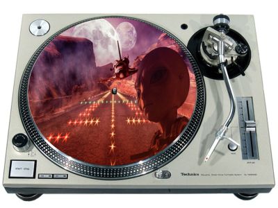 High quality felt turntable slipmat imprinted with an image of Alien Shuttle. The mat is regular thickness (3/32" or 2mm) and is sized to fit any 12 inch turntable. It is anti static, has a glazed bottom to grip and avoid slippage, feels great and works well for scratching or just playing your records. The image is impregnated into the surface of the mat, so it cannot scratch off or damage the record.