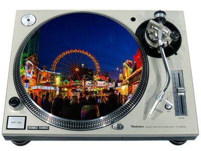 High quality felt turntable slipmat imprinted with an image of Fair Ground 2. The mat is regular thickness (3/32" or 2mm) and is sized to fit any 12 inch turntable. It is anti static, has a glazed bottom to grip and avoid slippage, feels great and works well for scratching or just playing your records. The image is impregnated into the surface of the mat, so it cannot scratch off or damage the record.