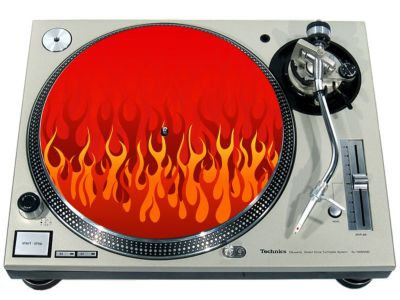 High quality felt turntable slipmat imprinted with an image of Fire Licks 2. The mat is regular thickness (3/32" or 2mm) and is sized to fit any 12 inch turntable. It is anti static, has a glazed bottom to grip and avoid slippage, feels great and works well for scratching or just playing your records. The image is impregnated into the surface of the mat, so it cannot scratch off or damage the record.
