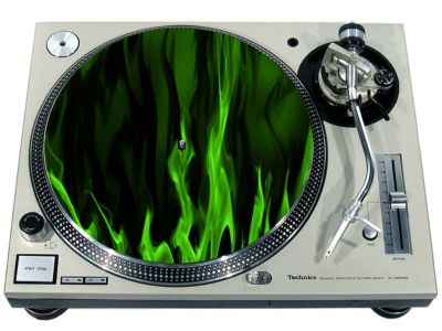 High quality felt turntable slipmat imprinted with an image of Fire Licks Green. The mat is regular thickness (3/32" or 2mm) and is sized to fit any 12 inch turntable. It is anti static, has a glazed bottom to grip and avoid slippage, feels great and works well for scratching or just playing your records. The image is impregnated into the surface of the mat, so it cannot scratch off or damage the record.