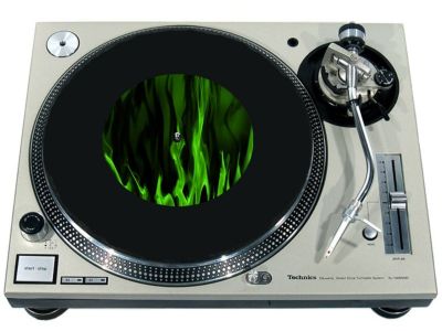High quality felt turntable slipmat imprinted with an image of Fire Licks Green. The mat is regular thickness (3/32" or 2mm) and is sized to fit any 7 inch turntable. It is anti static, has a glazed bottom to grip and avoid slippage, feels great and works well for scratching or just playing your records. The image is impregnated into the surface of the mat, so it cannot scratch off or damage the record.
