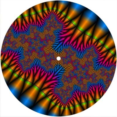 High quality felt turntable slipmat imprinted with an image of Fractal 27. The mat is regular thickness (3/32" or 2mm) and is sized to fit any 7 inch turntable. It is anti static, has a glazed bottom to grip and avoid slippage, feels great and works well for scratching or just playing your records. The image is impregnated into the surface of the mat, so it cannot scratch off or damage the record.