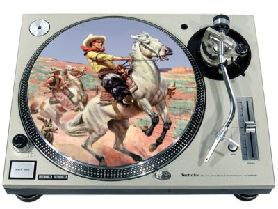 High quality felt turntable slipmat imprinted with an image of Horseback 1. The mat is regular thickness (3/32" or 2mm) and is sized to fit any 12 inch turntable. It is anti static, has a glazed bottom to grip and avoid slippage, feels great and works well for scratching or just playing your records. The image is impregnated into the surface of the mat, so it cannot scratch off or damage the record.