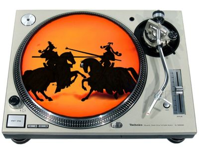 High quality felt turntable slipmat imprinted with an image of Joust 1. The mat is regular thickness (3/32" or 2mm) and is sized to fit any 12 inch turntable. It is anti static, has a glazed bottom to grip and avoid slippage, feels great and works well for scratching or just playing your records. The image is impregnated into the surface of the mat, so it cannot scratch off or damage the record.