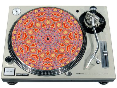 High quality felt turntable slipmat imprinted with an image of Kaleidoscope 3. The mat is regular thickness (3/32" or 2mm) and is sized to fit any 12 inch turntable. It is anti static, has a glazed bottom to grip and avoid slippage, feels great and works well for scratching or just playing your records. The image is impregnated into the surface of the mat, so it cannot scratch off or damage the record.