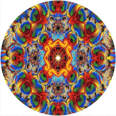 High quality felt turntable slipmat imprinted with an image of Kaleidoscope 6. The mat is regular thickness (3/32" or 2mm) and is sized to fit any 7 inch turntable. It is anti static, has a glazed bottom to grip and avoid slippage, feels great and works well for scratching or just playing your records. The image is impregnated into the surface of the mat, so it cannot scratch off or damage the record.