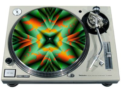 High quality felt turntable slipmat imprinted with an image of Kaleidoscope 7. The mat is regular thickness (3/32" or 2mm) and is sized to fit any 12 inch turntable. It is anti static, has a glazed bottom to grip and avoid slippage, feels great and works well for scratching or just playing your records. The image is impregnated into the surface of the mat, so it cannot scratch off or damage the record.
