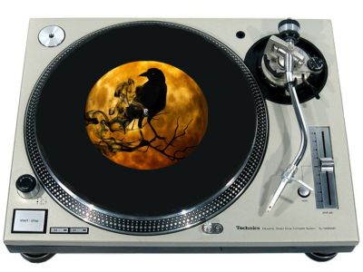 High quality felt turntable slipmat imprinted with an image of Moon Raven. The mat is regular thickness (3/32" or 2mm) and is sized to fit any 7 inch turntable. It is anti static, has a glazed bottom to grip and avoid slippage, feels great and works well for scratching or just playing your records. The image is impregnated into the surface of the mat, so it cannot scratch off or damage the record.