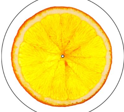 High quality felt turntable slipmat imprinted with an image of Orange Slice 2. The mat is regular thickness (3/32" or 2mm) and is sized to fit any 12 inch turntable. It is anti static, has a glazed bottom to grip and avoid slippage, feels great and works well for scratching or just playing your records. The image is impregnated into the surface of the mat, so it cannot scratch off or damage the record.