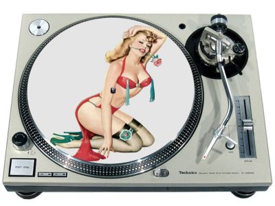 High quality felt turntable slipmat imprinted with an image of Pin-up Red Knealing Tassles & Rose. The mat is regular thickness (3/32" or 2mm) and is sized to fit any 12 inch turntable. It is anti static, has a glazed bottom to grip and avoid slippage, feels great and works well for scratching or just playing your records. The image is impregnated into the surface of the mat, so it cannot scratch off or damage the record.