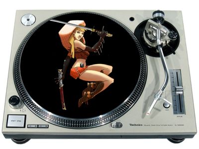 High quality felt turntable slipmat imprinted with an image of Pinup Samurai. The mat is regular thickness (3/32" or 2mm) and is sized to fit any 12 inch turntable. It is anti static, has a glazed bottom to grip and avoid slippage, feels great and works well for scratching or just playing your records. The image is impregnated into the surface of the mat, so it cannot scratch off or damage the record.