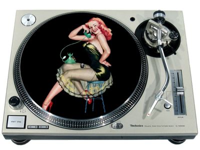 High quality felt turntable slipmat imprinted with an image of Pin-up Wrong Number. The mat is regular thickness (3/32" or 2mm) and is sized to fit any 12 inch turntable. It is anti static, has a glazed bottom to grip and avoid slippage, feels great and works well for scratching or just playing your records. The image is impregnated into the surface of the mat, so it cannot scratch off or damage the record.