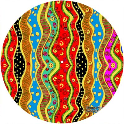 High quality felt turntable slipmat imprinted with an image of Pop Art Pattern 1. The mat is regular thickness (3/32" or 2mm) and is sized to fit any 12 inch turntable. It is anti static, has a glazed bottom to grip and avoid slippage, feels great and works well for scratching or just playing your records. The image is impregnated into the surface of the mat, so it cannot scratch off or damage the record.