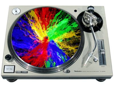 High quality felt turntable slipmat imprinted with an image of Colorful Splash. The mat is regular thickness (3/32" or 2mm) and is sized to fit any 12 inch turntable. It is anti static, has a glazed bottom to grip and avoid slippage, feels great and works well for scratching or just playing your records. The image is impregnated into the surface of the mat, so it cannot scratch off or damage the record.