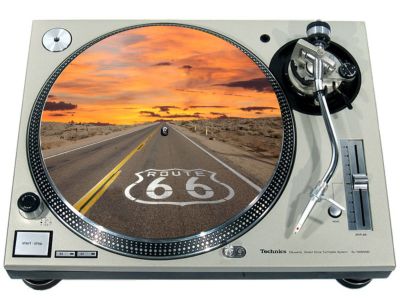 High quality felt turntable slipmat imprinted with an image of Route 66 1. The mat is regular thickness (3/32" or 2mm) and is sized to fit any 12 inch turntable. It is anti static, has a glazed bottom to grip and avoid slippage, feels great and works well for scratching or just playing your records. The image is impregnated into the surface of the mat, so it cannot scratch off or damage the record.